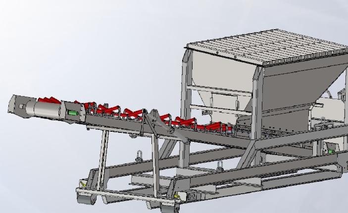 Der Annahmeförderer ist wie alle Module ebenfalls auf einem 6,5m Containergrundrahmen aufgebaut. Er besitzt einen Aufgabetrichter, der z.B. mit einem Radlader beschickt werden kann und das zu recycelnde Material aufnimmt und zum nächsten Modul, z.B. Siebmodul, weitertransportiert.